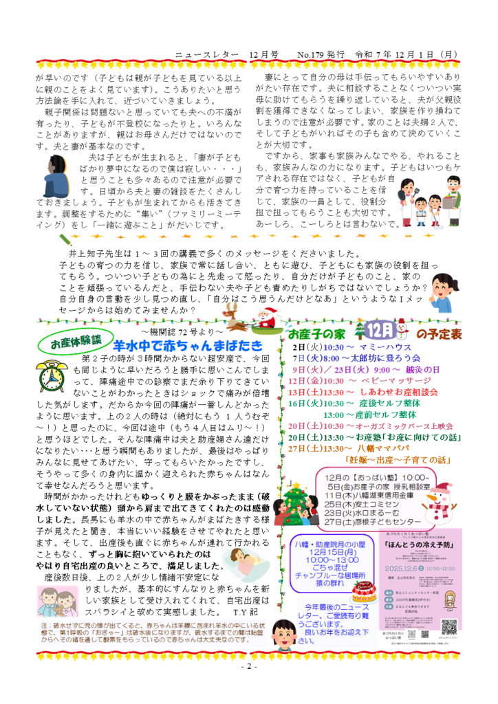 2025年12月10日 / 最終更新日時 : 2025年12月10日 osankoko お産&子育てを支える会より ニュースレター12月号 No.179 お産&子育てを支える会からニュースレターが届きました。 ニュースレターNo.179ダウンロード FacebooktwitterCopy